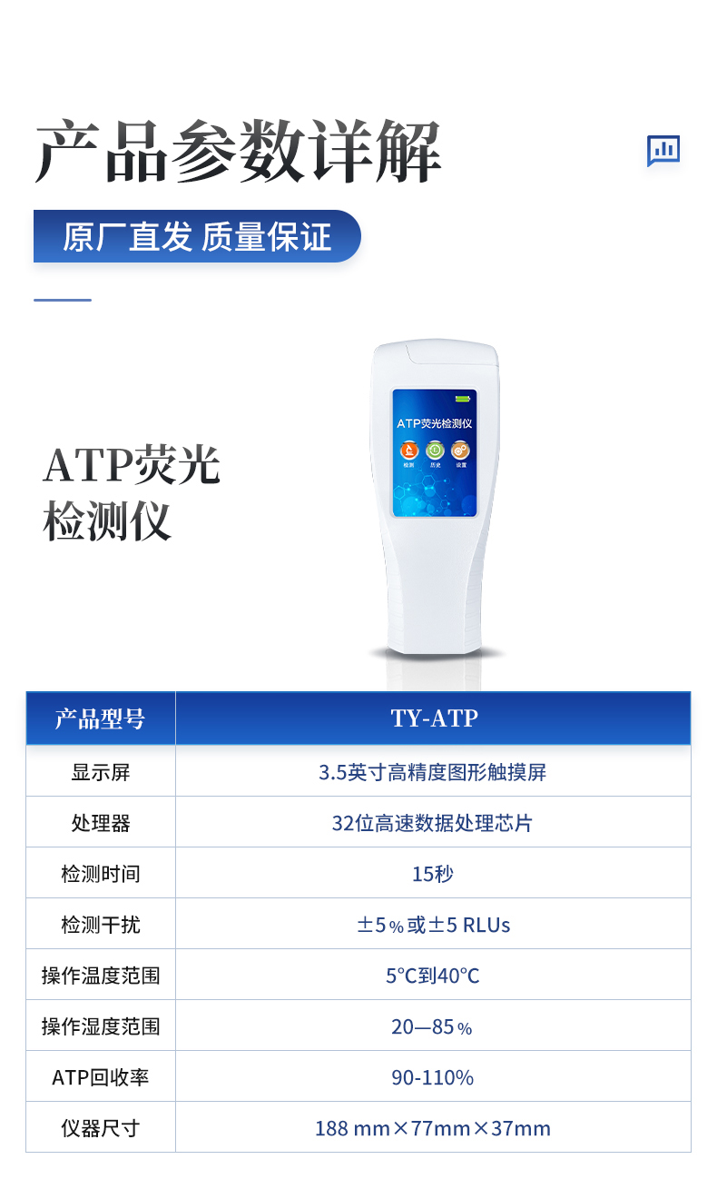 該設(shè)備為全新升級產(chǎn)品,大屏幕觸摸顯示屏,代替?zhèn)鹘y(tǒng)按鍵。操作采用生物化學(xué)反應(yīng)方法檢測ATP含量,ATP熒光檢測儀基于螢火蟲發(fā)光原理,利用“熒光素酶—熒光素體系”快速檢測三磷酸腺苷(ATP)。ATP拭子含有可以裂解細(xì)胞膜的試劑,能將細(xì)胞內(nèi)ATP釋放出來,與試劑中含有的特異性酶發(fā)生反應(yīng),產(chǎn)生光,再用熒光照度計檢測發(fā)光值,微生物的數(shù)量與發(fā)光值成正比,由于所有生物活細(xì)胞中含有恒量的ATP,所以ATP含量可以清晰地表明樣品中微生物與其他生物殘余的多少,用于判斷衛(wèi)生狀況。